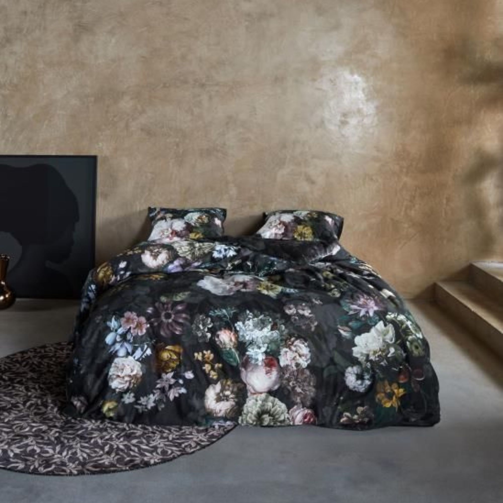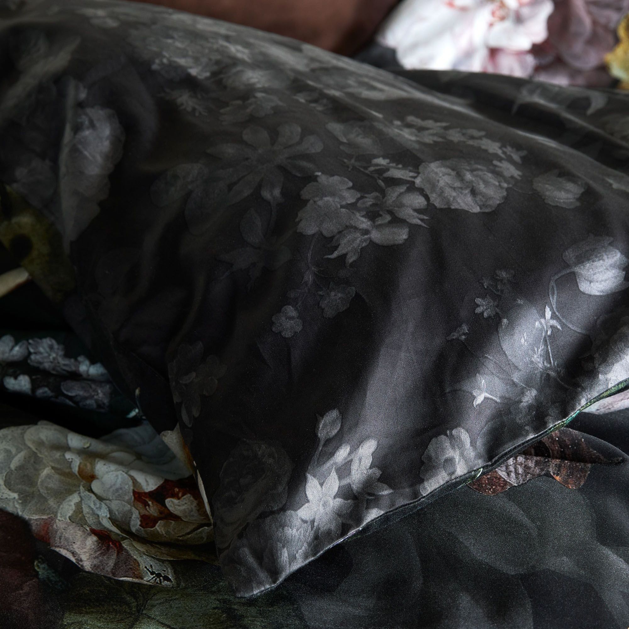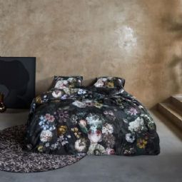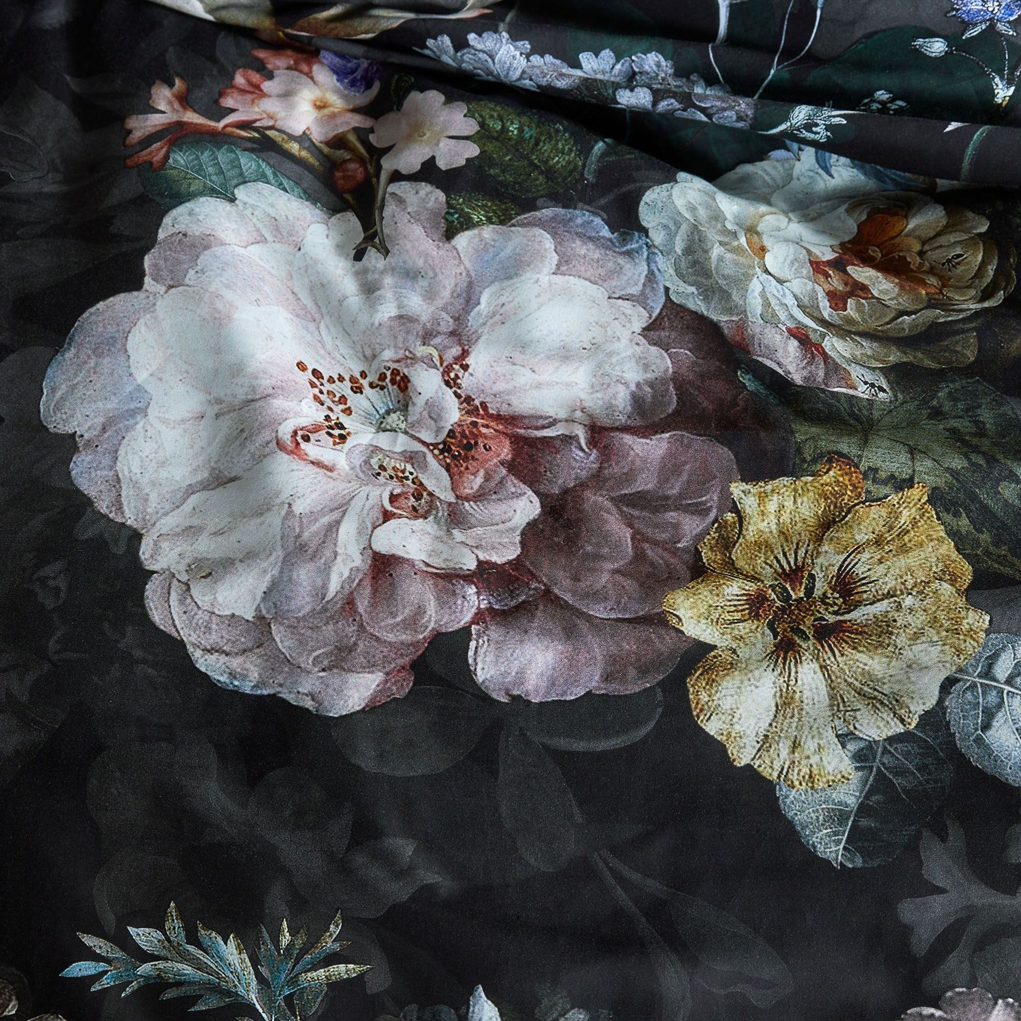 Blomstret sengetøj 140x200 cm - Sort sengesæt i 100% bomuldssatin - Fleur Festive Blooming - Essenza sengelinned