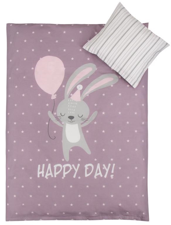 Super skønt sengesæt af en sød kanin med en ballon i hånden. Sengesættet er dobbelt faced/vendbart med forskelligt motiv for og bag. Bagsiden er med fine lilla og grå striber.