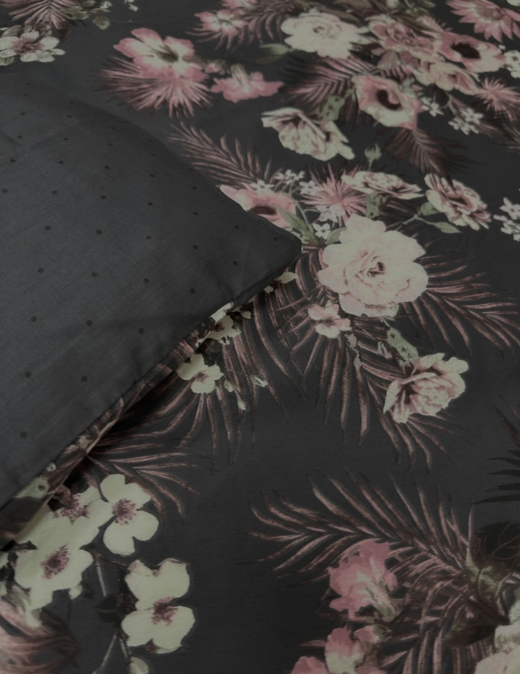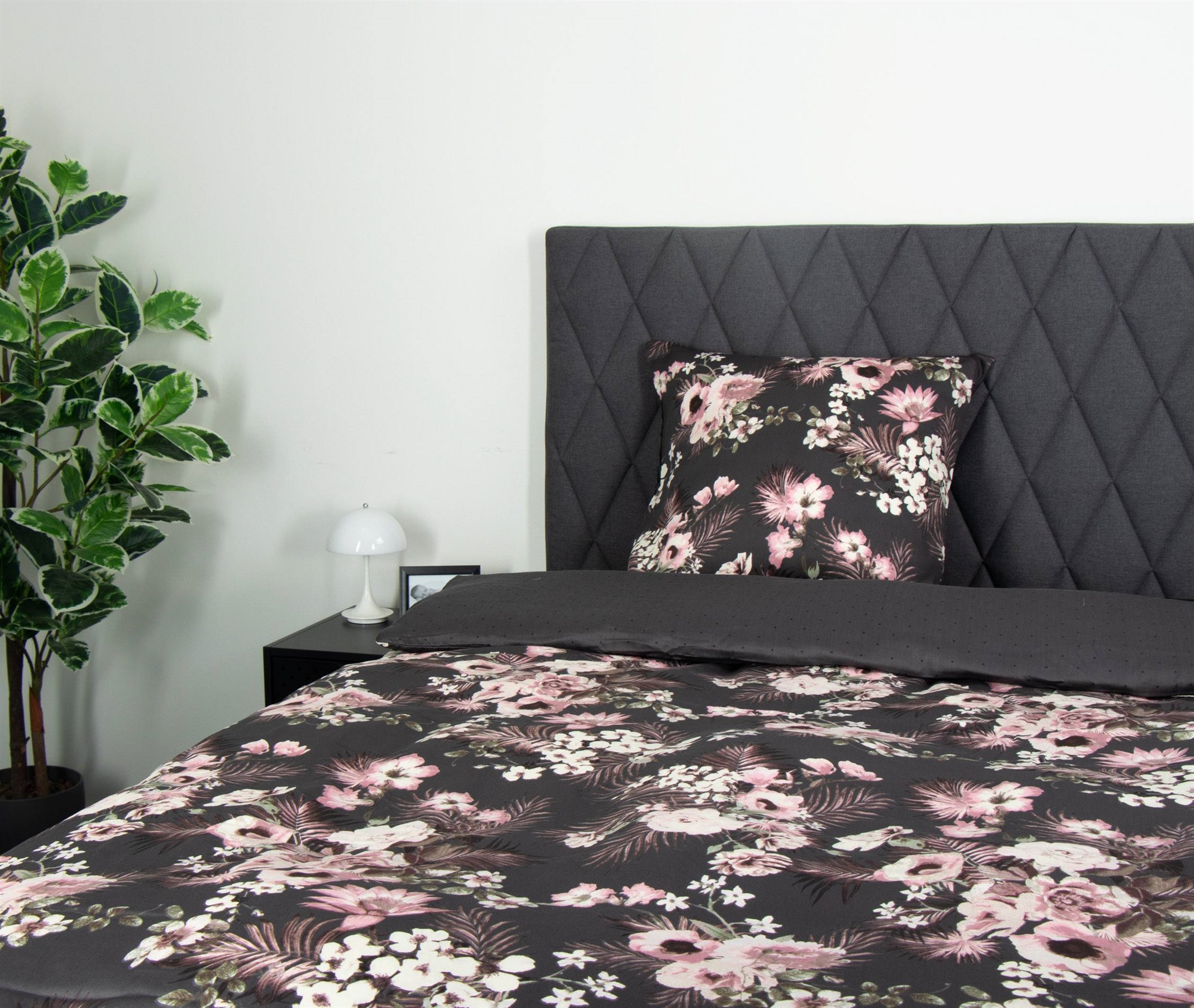 Sengetøj 150x210 cm - Vendbart design i 100% Bomuldssatin - Flowers & Dots grå - Sengesæt fra By Night
